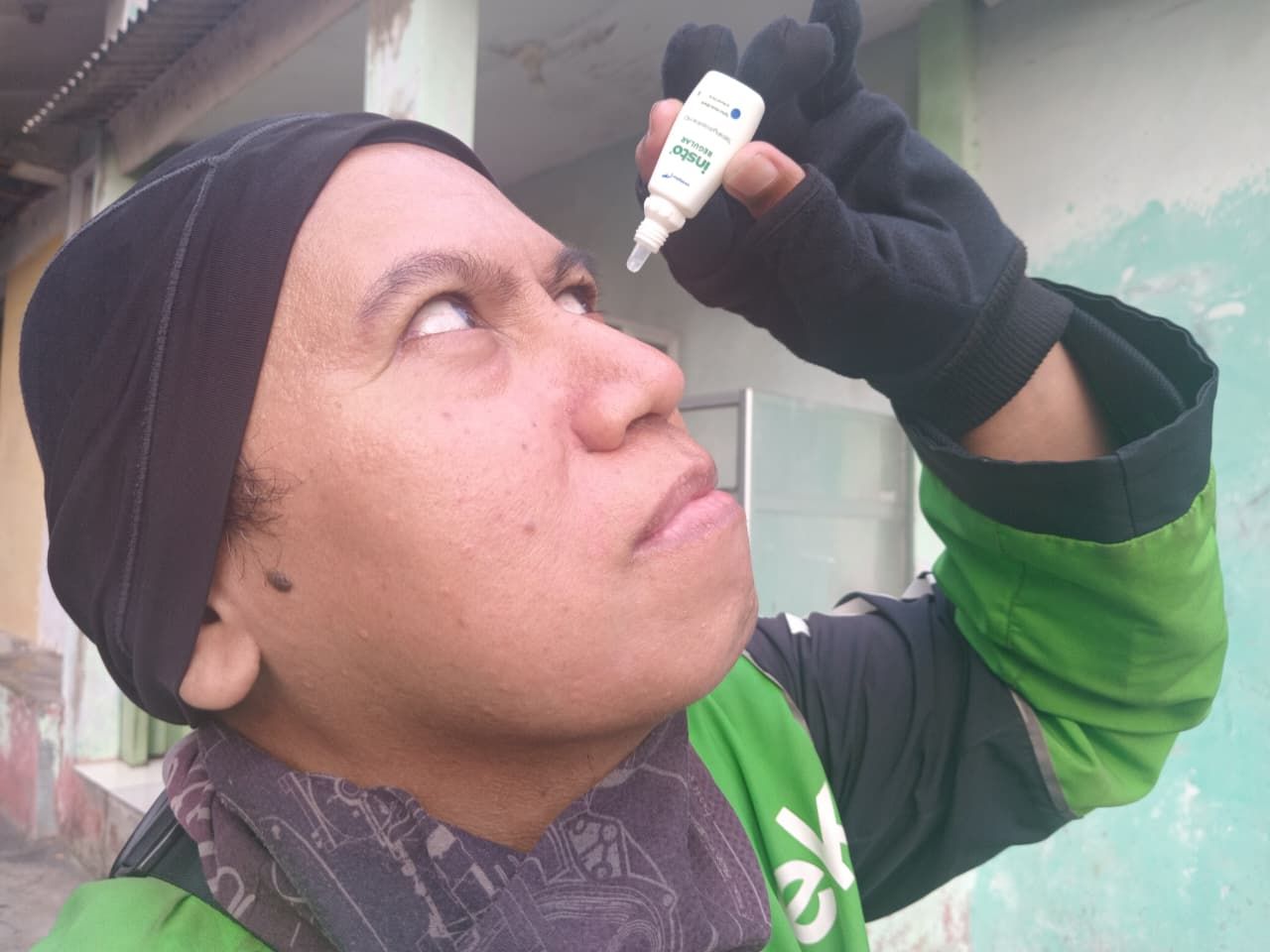 Mata yang kering dan gatal, kerap memantik keinginan Daud untuk mengucek atau memejamkan mata lebih lama. “Tetapi selalu saya tahan, karena sangat berbahaya, mata bisa terluka. Terlebih saat melaju dalam kecepatan tinggi,bisa membahayakan keselamatan,”urainya. Apa yang dialami Daud bukanlah hal sepele. Mata yang sangat kering (sepet) membuat lapisan kornea tidak rata, sehingga bayangan objek menjadi tidak fokus. Tak hanya itu, paparan polusi terus-menerus dapat menyebabkan peradangan jangka panjang (konjungtivitis) atau tumbuhnya selaput pada mata (pterigium).